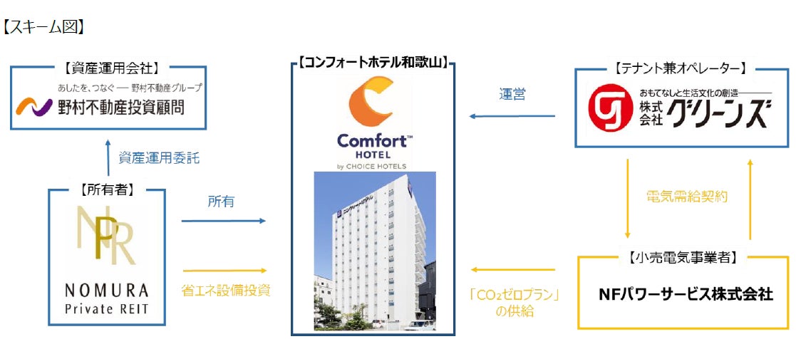 用を受託する野村不動産プライベート投資法人(以下「本投資法人」)が、本投資法人の保有する「コンフォートホテル和歌山」及び「コンフォートホテル佐賀」(以下、総称して「本物件」)のテナント兼オペレーターである株式会社グリーンズ(本社:三重県四日市市/代表取締役社長:村木 雄哉、以下「グリーンズ」)と、本物件におけるサステナビリティへの取組みを協働して推進していくことについて合意しましたので、お知らせいたします。