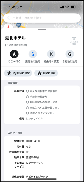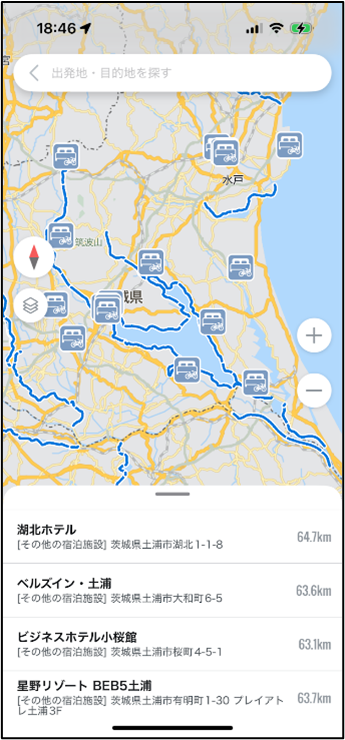 茨城県と土浦市が認定したサイクリストにやさしい宿情報をナビタイムジャパンが受領してデータ化し、『自転車NAVITIME』内に表示します。専用のアイコンを用いて地図上に表示し、地図からの周辺検索、フリーワード検索を利用できます。