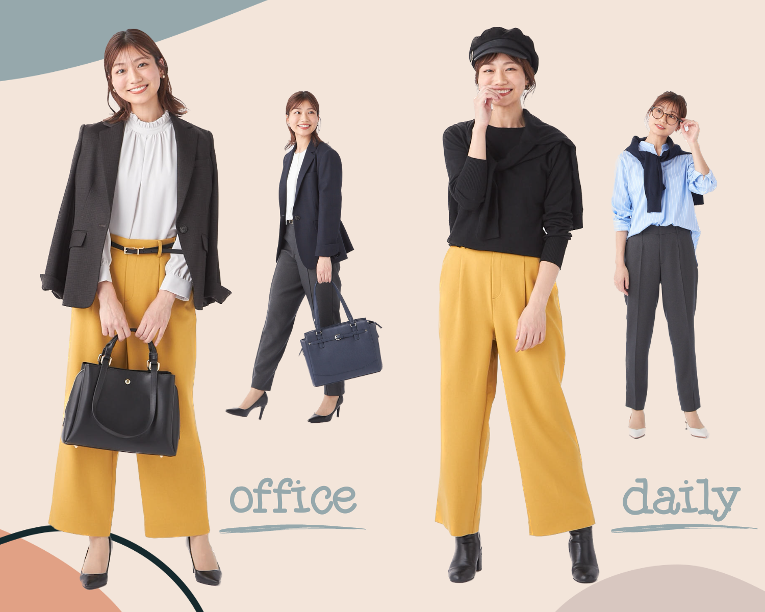 春シーズンに登場した単品パンツシリーズから、秋冬シーズンにはける新デザインを発売開始いたします。シンプルなデザインと柔らかい風合いがオフィススタイルにマッチします。選べる全4デザインで、パンツのシルエットは、ワイド、スティック(細めのストレートシルエット)、ワンタックテーパードの3型を採用。スティックパンツは内股シームレス仕様にし、履き心地にもこだわりました。好みに合わせたスタイリングをお楽しみいただけます。
