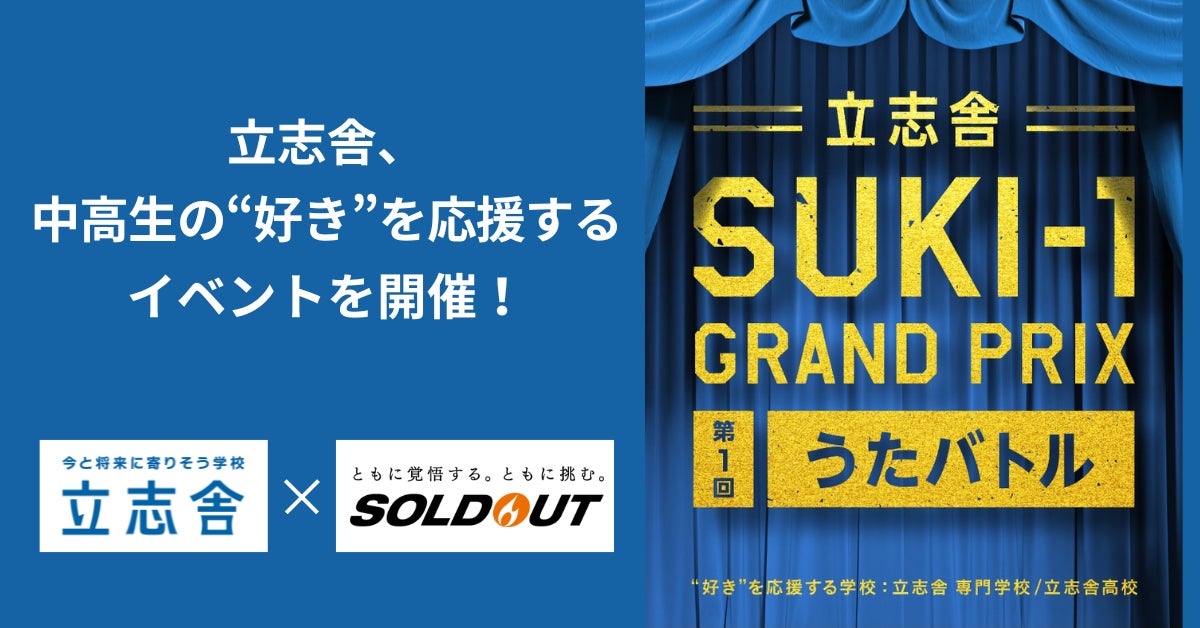 地方を含む全国の志ある中堅・中小企業の成長支援をマーケティング領域で展開するソウルドアウト株式会社(本社:東京都文京区 代表取締役社長CEO兼CCO:荒波 修、以下「ソウルドアウト」)は、東京ITプログラミング&会計専門学校や東京法律公務員専門学校など全国で24校を展開する学校法人立志舎(以下「立志舎」)が、2025年3月、全国の中高生を対象に自分の「好き」を歌で表現するイベント「SUKI-1GRAND PRIX 第1回うたバトル」を開催するにあたり、企画・運営・集客支援などを行いました。