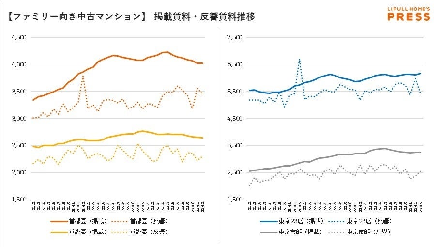 2023年12月の首都圏ファミリー向き中古マンションの掲載平均価格は4,022万円(前月比99.9%・前年比98.6%)、反響平均価格は3,446万円(前月比97.0%・前年比108.3%)、近畿圏ファミリー向き中古マンションの掲載平均価格は2,641万円(前月比99.6%・前年比95.5%)、反響平均価格は2,300万円(前月比103.7%・前年比95.7%)となった。