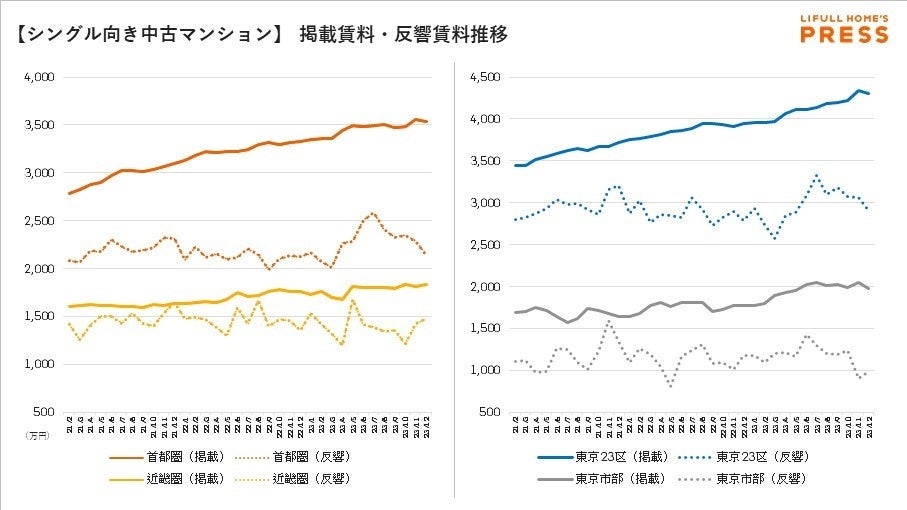 2023年12月の首都圏シングル向き中古マンションの掲載平均価格は3,533万円(前月比99.3%・前年比106.2%)、反響平均価格は2,138万円(前月比93.5%・前年比100.7%)、近畿圏シングル向き中古マンションの掲載平均価格は1,837万円(前月比101.5%・前年比104.4%)、反響平均価格は1,478万円(前月比103.7%・前年比108.8%)となった。