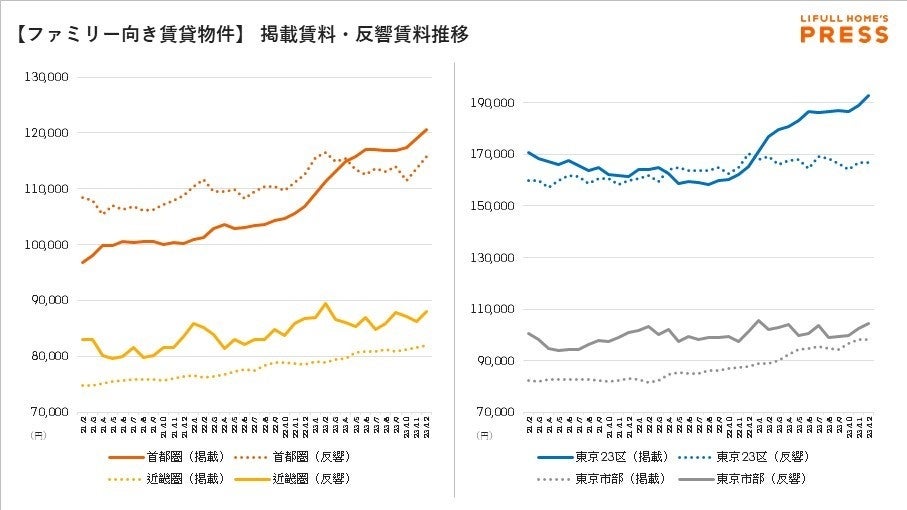 2023年12月の首都圏ファミリー向き賃貸物件の掲載平均賃料は12万637円(前月比101.3%・前年比113.0%)、反響平均賃料は11万5,788円(前月比101.9%・前年比102.8%)、近畿圏ファミリー向き賃貸物件の掲載平均賃料は8万1,902円(前月比100.3%・前年比104.2%)、反響平均賃料は8万8,084円(前月比102.1%・前年比101.4%)となった。