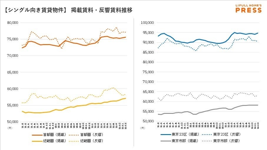 2023年12月の首都圏シングル向き賃貸物件の掲載平均賃料は7万5,623円(前月比100.3%・前年比102.9%)、反響平均賃料は7万7,084円(前月比99.9%・前年比104.5%)、近畿圏シングル向き賃貸物件の掲載平均賃料は5万7,128円(前月比100.4%・前年比103.1%)、反響平均賃料は5万8,367円(前月比100.6%・前年比100.2%)となった。