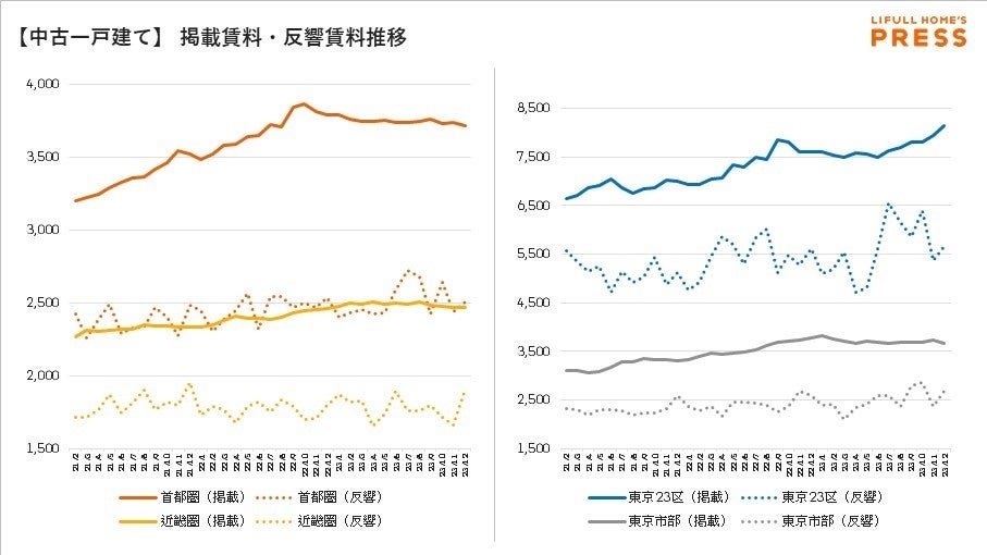 2023年12月の首都圏中古一戸建ての掲載平均価格は3,713万円(前月比99.5%・前年比98.0%)、反響平均価格は2,503万円(前月比102.5%・前年比98.6%)、近畿圏中古一戸建ての掲載平均価格は2,466万円(前月比99.8%・前年比100.2%)、反響平均価格は1,907万円(前月比114.9%・前年比106.1%)となった。