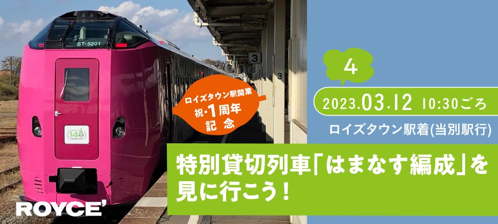 新駅誕生1周年!特別貸切列車 春色の特急「はまなす編成」で行く!当別町・ロイズ工場見学・体験施設ロイズカカオ&チョコレートタウンツアー」で札沼線(学園都市線)を走ります。