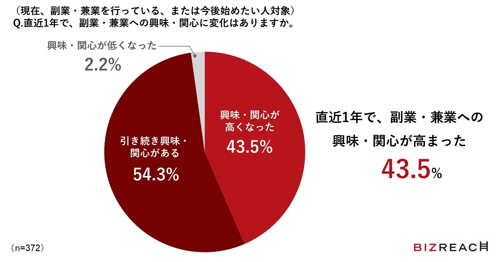 さらに、直近1年で副業・兼業への興味・関心が高くなった方は43.5%で、副業・兼業を考えるビジネスパーソンが急激に増加していることが分かりました。興味・関心に変化があった理由として、日本経済や労働環境の変化による将来への不安から、キャリア自律の意識が高まっていることが考えられます。自身のキャリアを中長期的に捉え、副業・兼業を始めるビジネスパーソンが今後、増加することが予測されます。