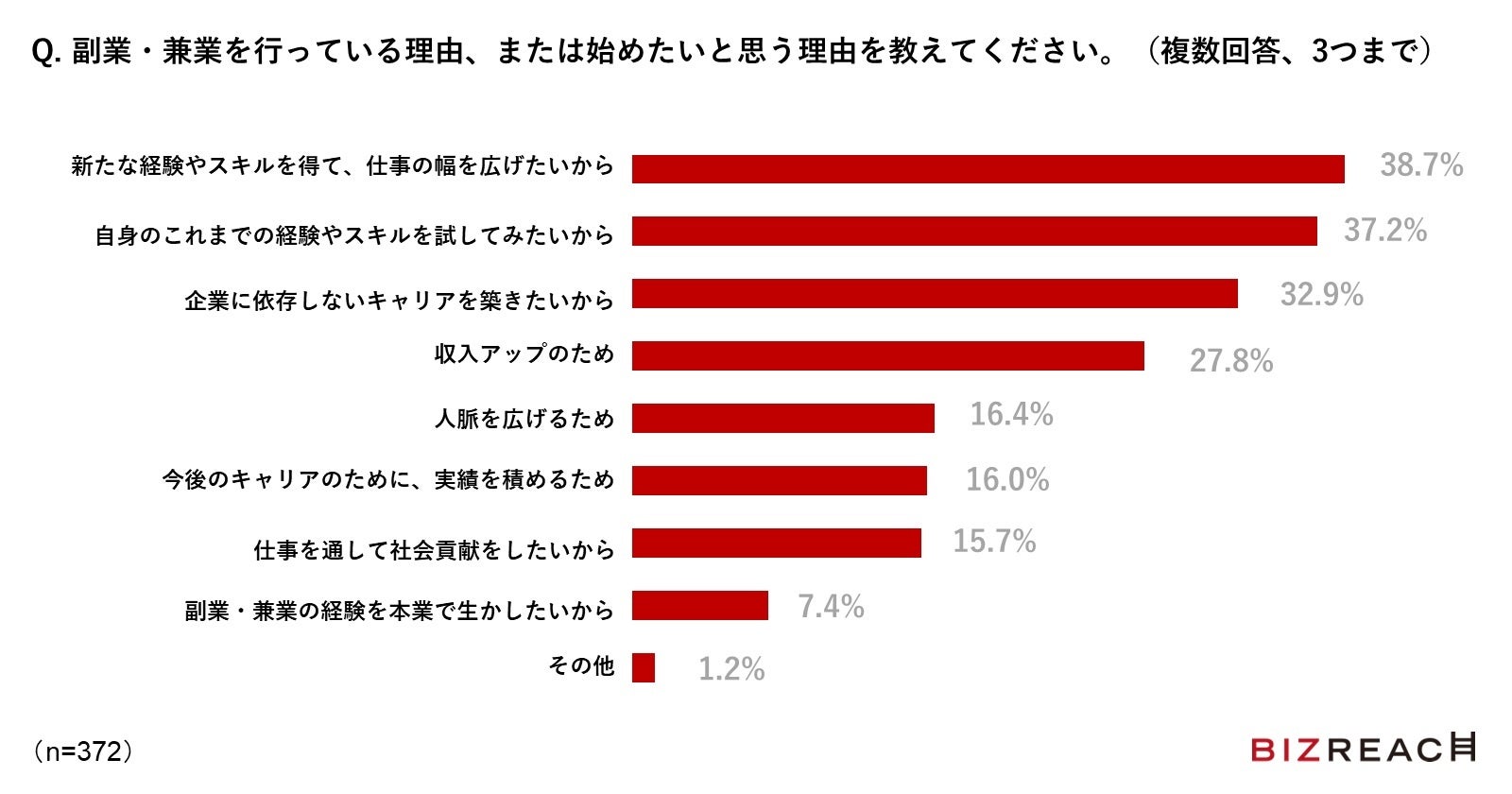 副業・兼業を行っている、または始めたい理由は、「新たな経験やスキルを得て、仕事の幅を広げたいから(38.7%)」が最も多く、「自身のこれまでの経験やスキルを試してみたいから(37.2%)」「企業に依存しないキャリアを築きたいから(32.9%)」が続く結果となりました。