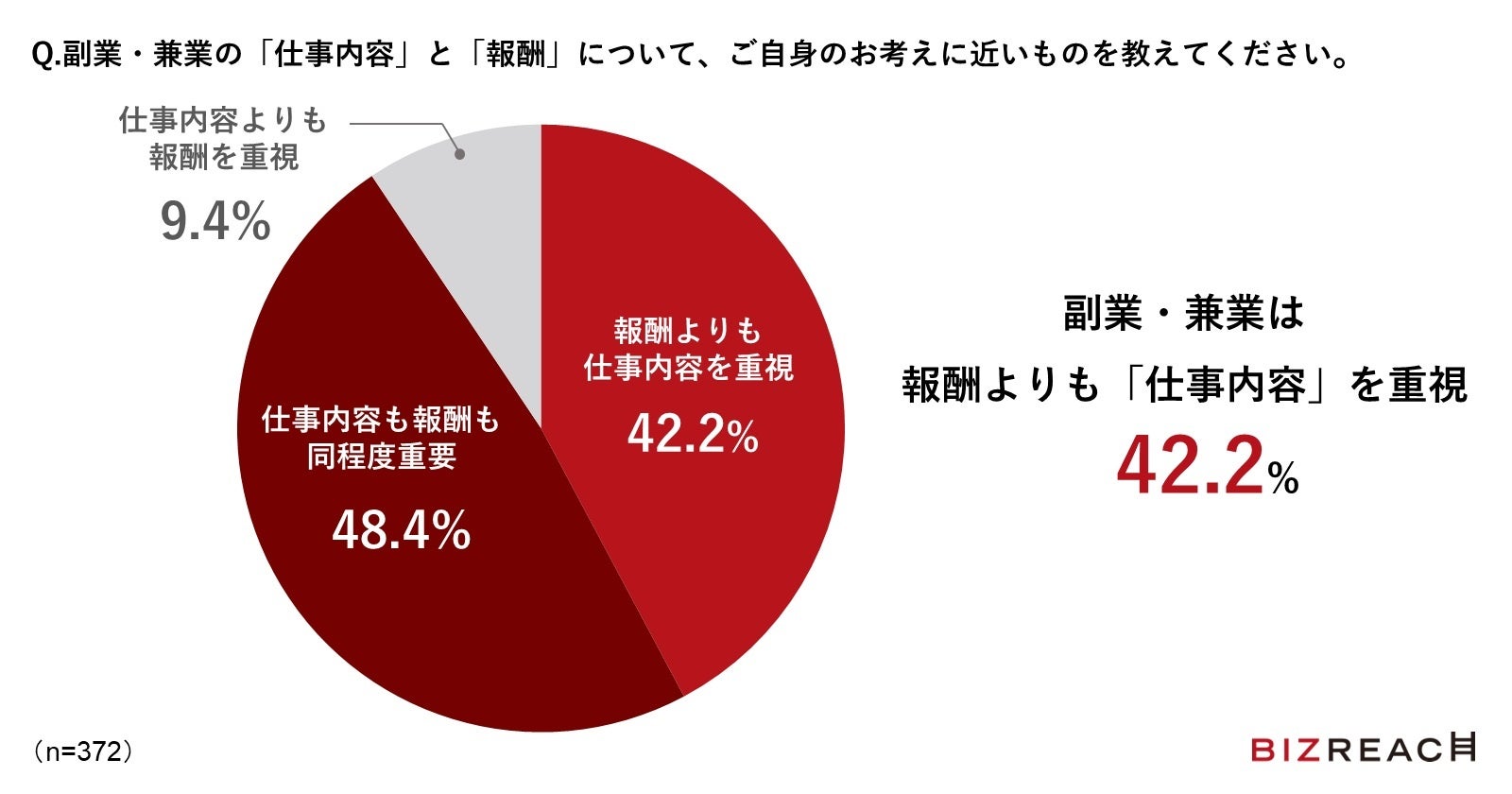 ■副業・兼業をしたい理由は「新たな経験やスキルを得て、仕事の幅を広げたい(38.7%)」が最多。42.2%が、報酬よりも「仕事内容」を重視
