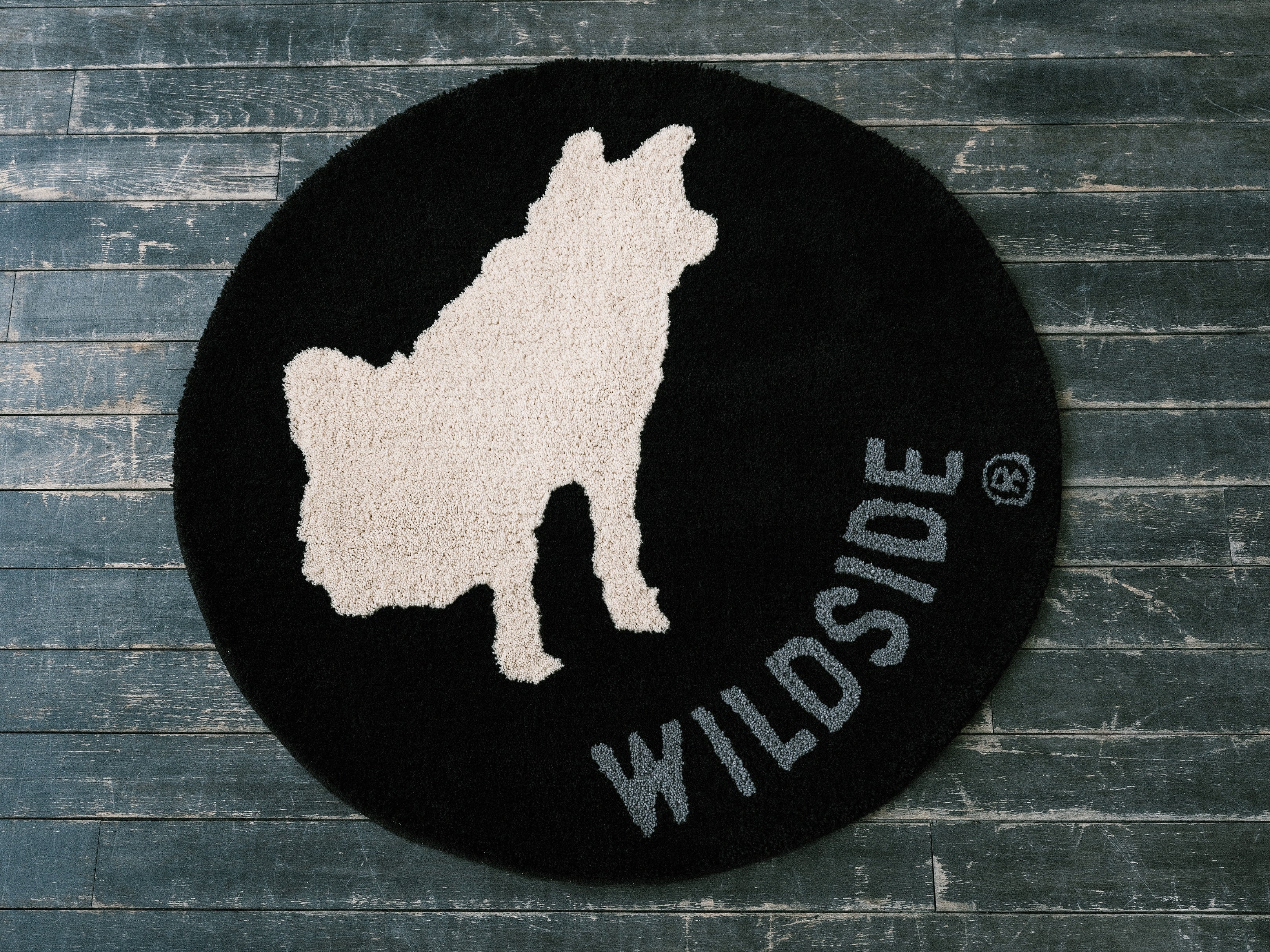 デザイナー山本耀司の愛犬である凛(リン)のシルエットとWILDSIDEのロゴを、ステンシルのように平面にデザインしたラウンド型のラグマット。直径80cmと、実用的なサイズになっております。