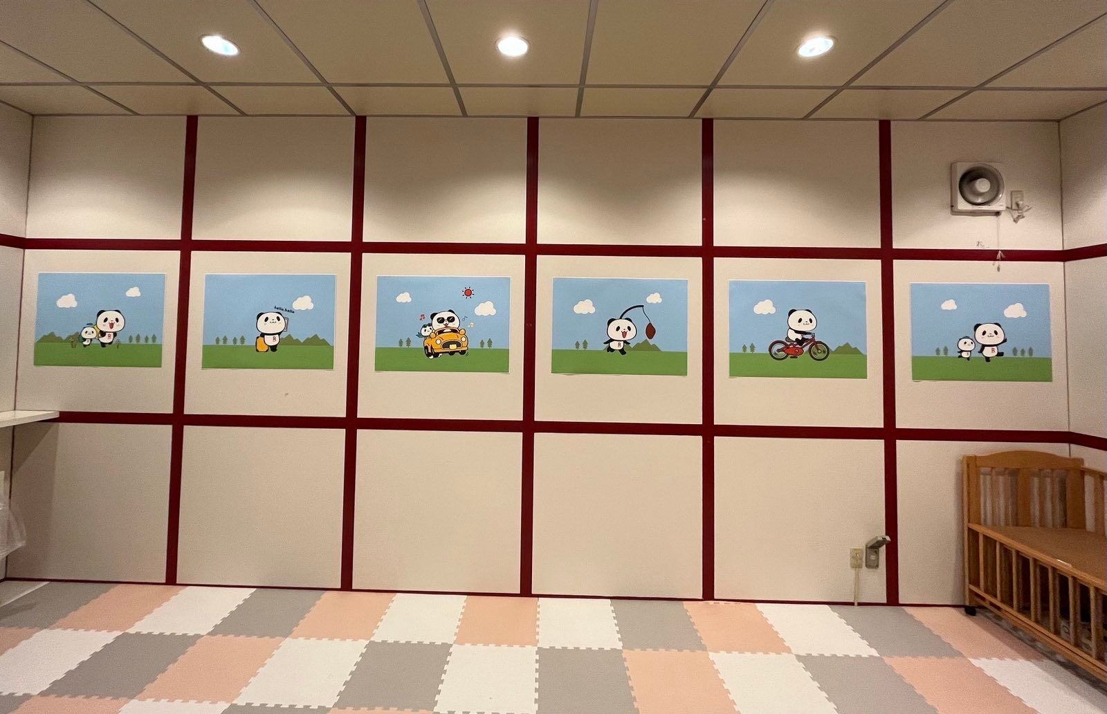 小さなお子様連れのお客様にご愛用いただいているスタジアム内の託児所を「お買いものパンダ」でラッピング。楽天イーグルスのユニフォームを着た「お買いものパンダ」や「小パンダ」のぬいぐるみや書籍もご用意しています。