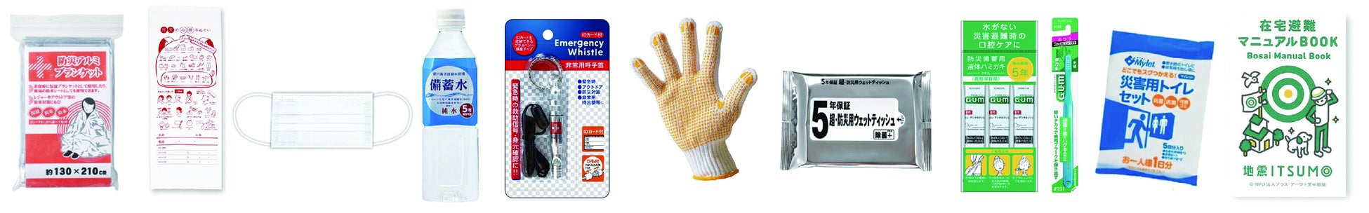 除菌シート、液体ハミガキと歯ブラシ、携帯トイレ、防災マニュアルBOOKなどに加え、