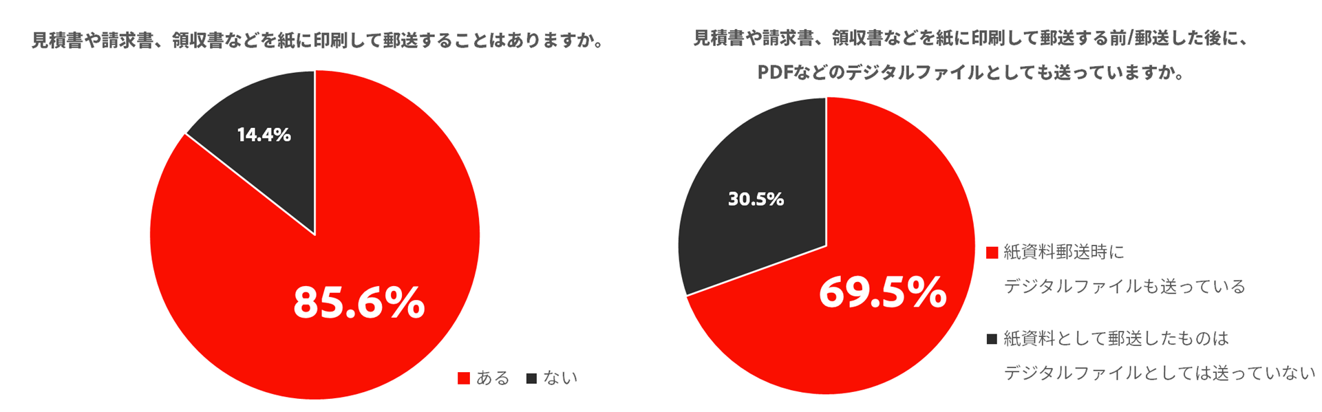 電子帳簿保存法の改定後(2024年2月末~3月)に実施したアドビの調査によると、「見積書や請求書、領収書などを紙に印刷して郵送することはありますか」という問いに対し、8割以上(85.6%)が「ある」と回答。また、「見積書や請求書、領収書などを紙に印刷して郵送する前/郵送した後に、PDFなどのデジタルファイルとしても送っていますか」という問いに対しては、約7割(69.5%)が「紙でもデジタルファイルでも送っている」と回答しました。