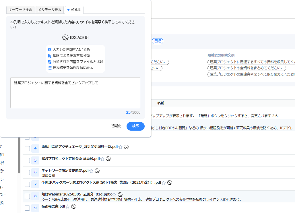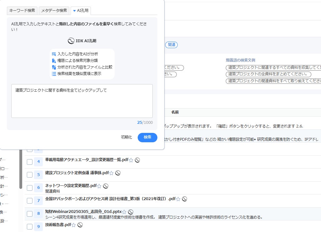AI IPGenius on IDX は、PDF、Word、PowerPoint、スキャン資料などの非構造データを対象に、内容理解ベースで検索・要約・解析を行う知の資産化ナレッジベースである。