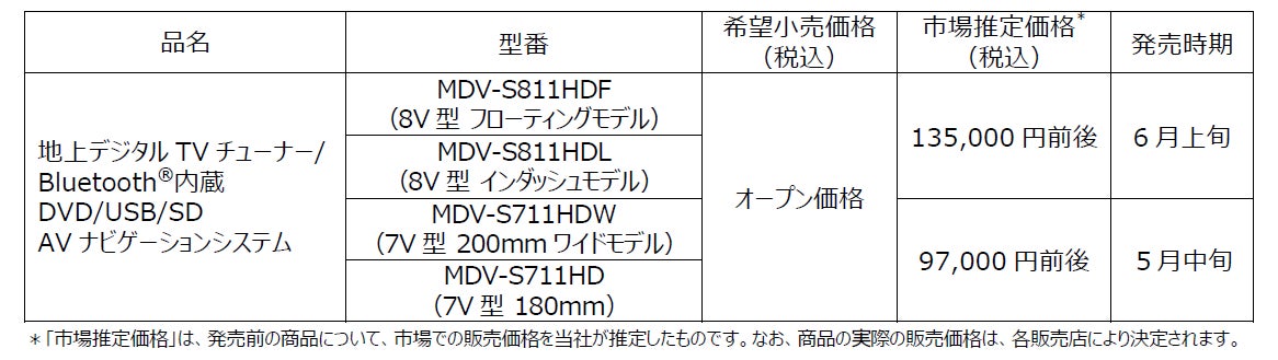 画面サイズは、前年モデルに引き続き、軽自動車やコンパクトカーに最適な8V型・7V型を採用。「MDV-S811HDF」(8V型 フローティングモデル)、「MDV-S811HDL」(8V型 インダッシュモデル)、「MDV-S711HDW」(7V型 200mmワイドモデル)、「MDV-S711HD」(7V型 180mm)をラインアップします。