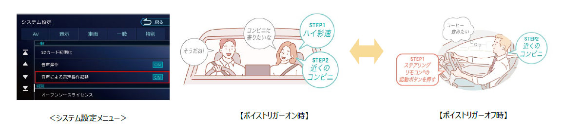 ハンドルから手を離さずに、発話してナビの操作ができる「音声操作」の起動を、音声で行うかボタン操作で行うかを設定できる「ボイストリガーのオン/オフ設定」を搭載。ボイストリガー(音声による音声操作起動)をオンにした場合、「ハイ彩速」と声をかけると音声操作が起動します。ボイストリガーをオフにした場合は、音声の影響を受けることなく、ステアリングリモコン※2などのボタン操作で音声操作を起動できます。