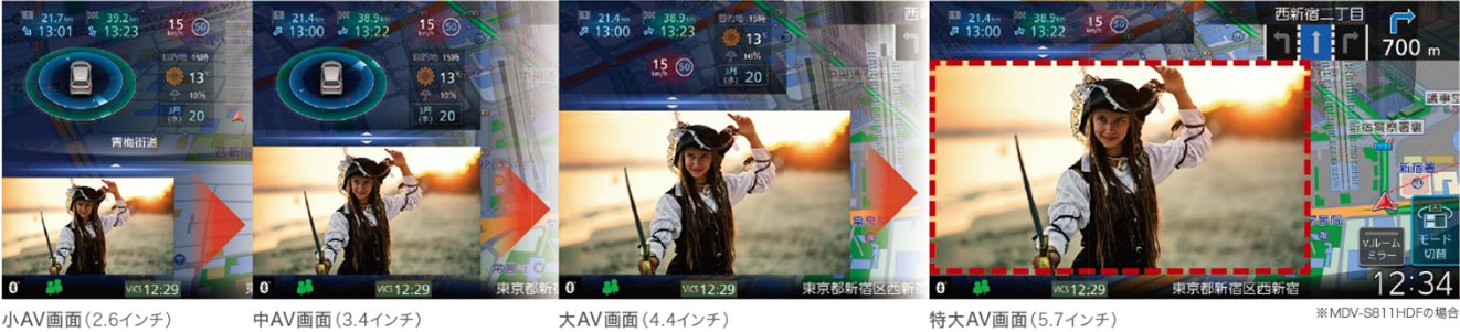 ※3:5.7インチの表示は8V型モデルの「MDV-S811HDF」と「MDV-S811HDL」のみ対応。7V型モデル(「MDV-S711HDW」「MDV-S711HD」)の特大AV画面表示は5.0インチ。
