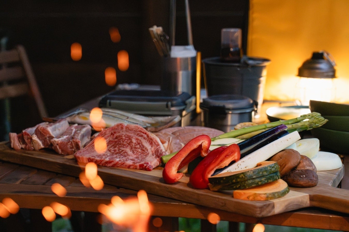 ご夕食は宍粟市特産品のA5ランク宍粟牛のステーキを始めとする食材で楽しむBBQ。