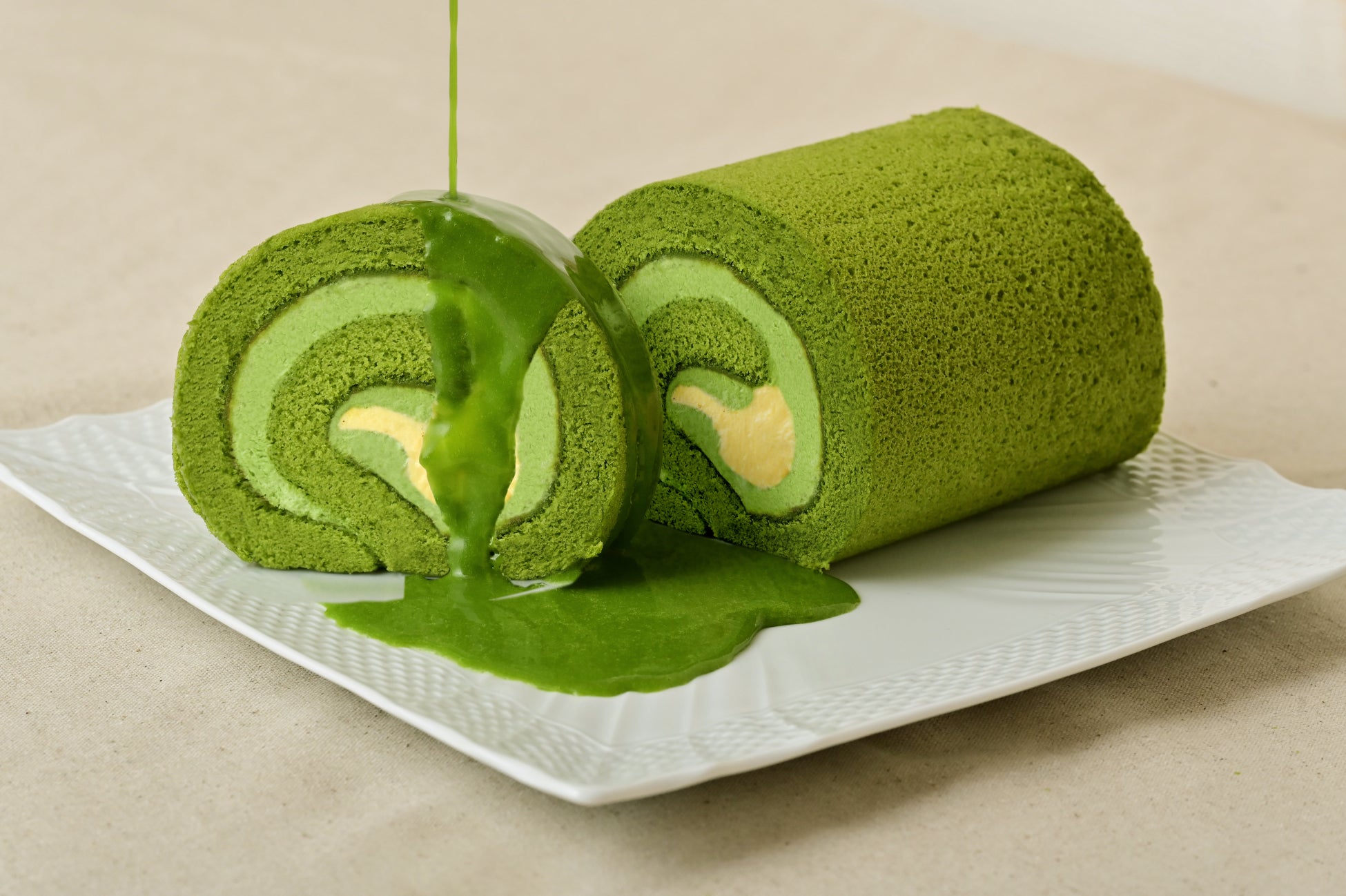 特製抹茶餡ソースをかけて食べる宇治の一番茶を使用した新作ロールケーキ