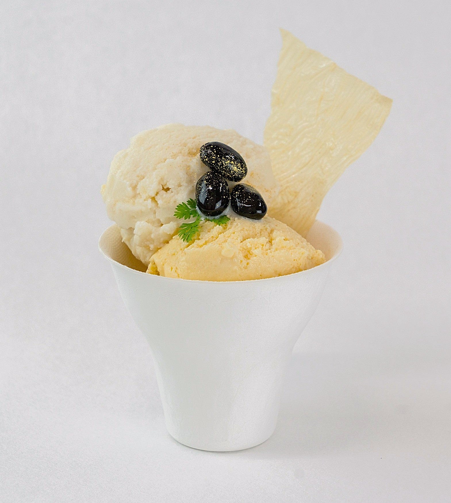 京ゆばづくりに欠かせない豆乳”ゆば汁”と、看板商品の”くみあげ湯葉”をふんだんに使用したゆばのソルベ&アイスに、湯葉チュイル、黒豆をトッピングしたゆば好きにはたまらない新感覚パフェ。