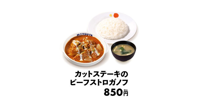 | 商品名 カットステーキのビーフストロガノフ 850円 ※単品でのご購入、テイクアウトが可能です。 ※税込み価格です。 発売日 2022年12月20日(火)午前10時 ~ 対象店舗 一部店舗を除く全国の松屋 |