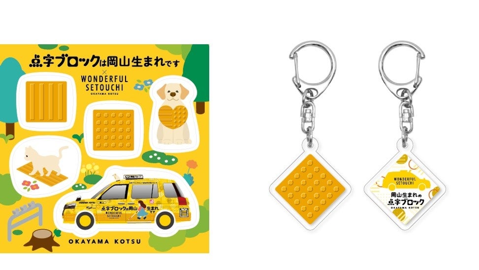 乗車特典:「点字ブロックタクシー」にご乗車いただいたお客様には、オリジナルデザインのシールとアクリルキーホルダーを無料でプレゼントいたします。
