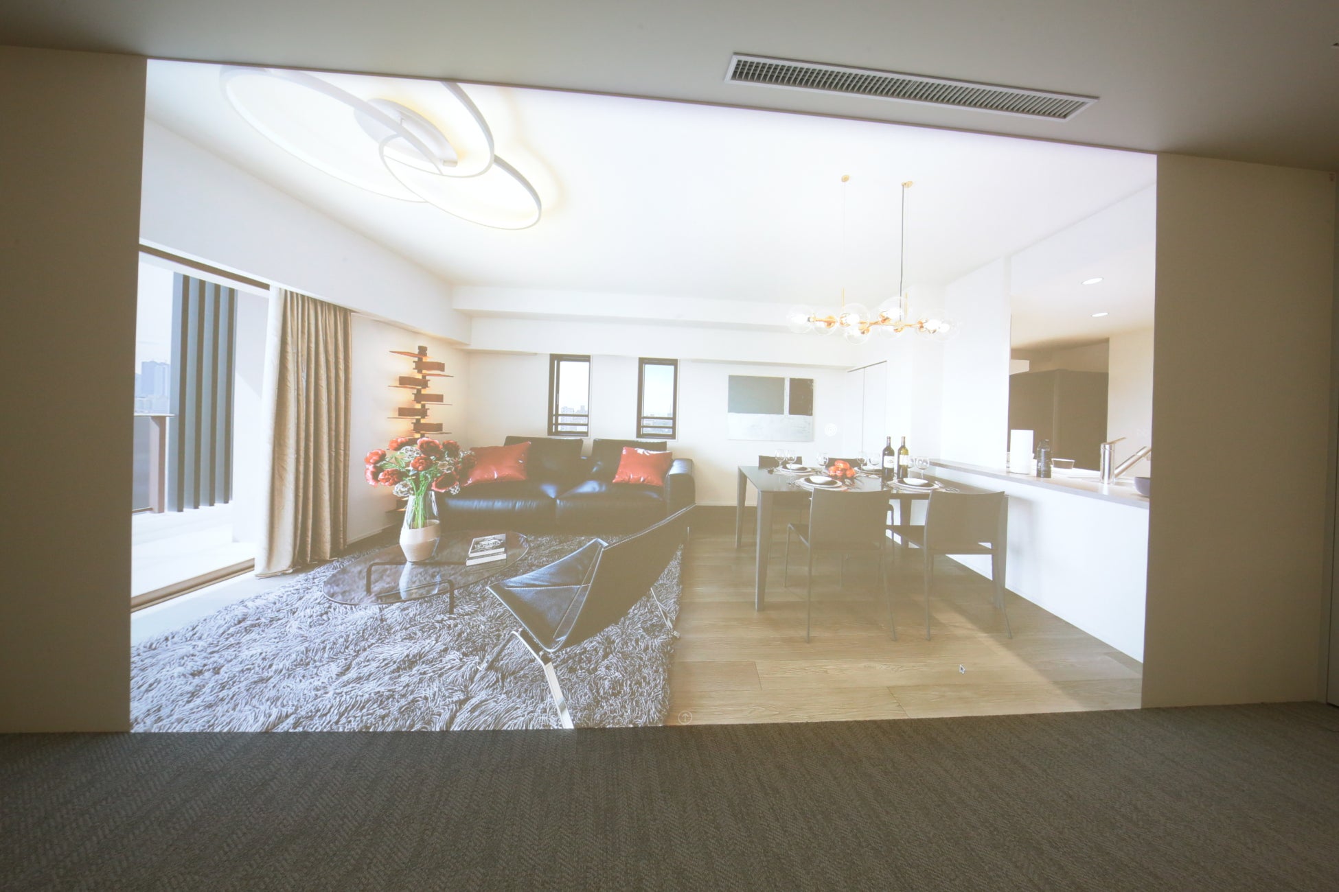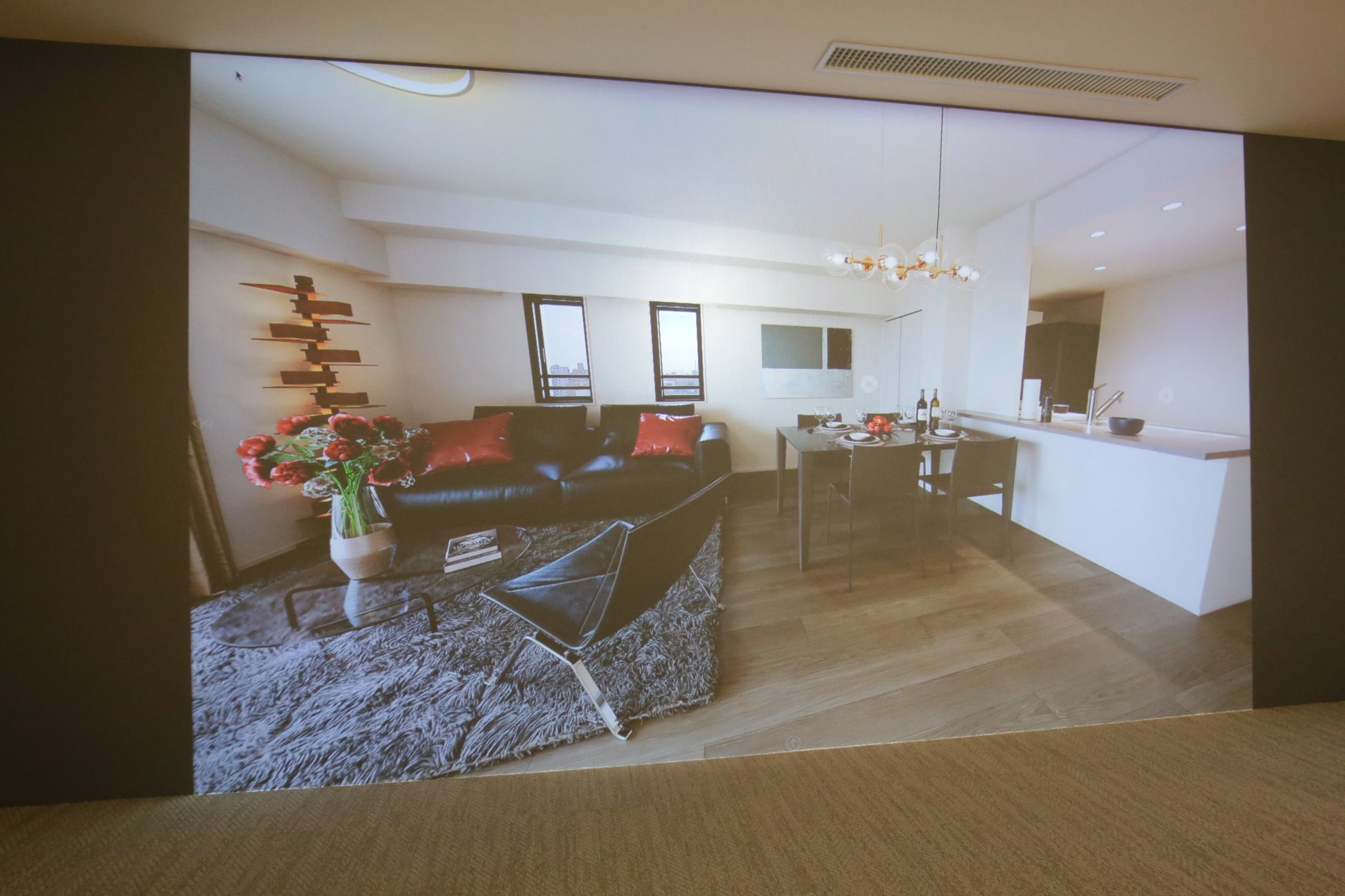 Brillia Gallery新宿において従来運用していたVRモデルルームをリニューアルし、約200インチの投影画面に光を滞留させ発光する量子ドットの性質を応用した特殊塗料「Immersive magic wall」を導入しました。LEDや液晶画面にも匹敵するハイコントラストなプロジェクター投影により、間取りや住戸からの眺望、エントランス等の共用部などを高精細かつ実寸大に近いスケールで体験することが可能です。