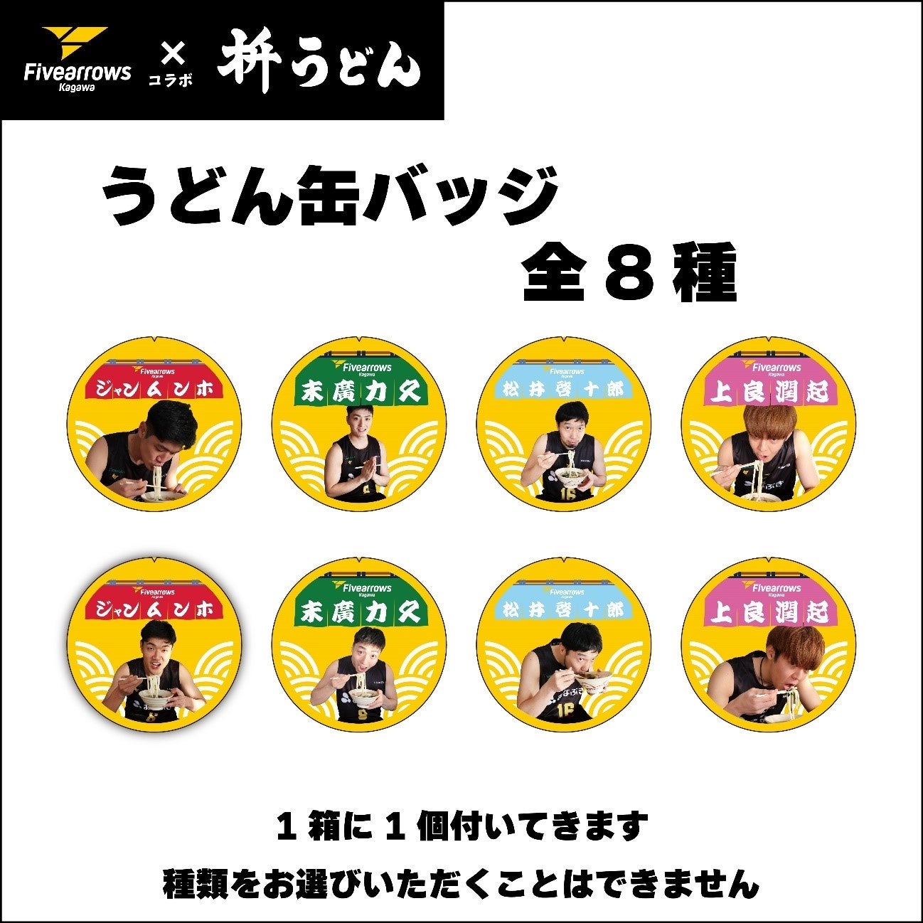 また、商品には特製うどん缶バッジがランダムで1個付属!実際に選手がうどんを食べている風景を缶バッジにした、ここでしか手に入らないアイテムです!