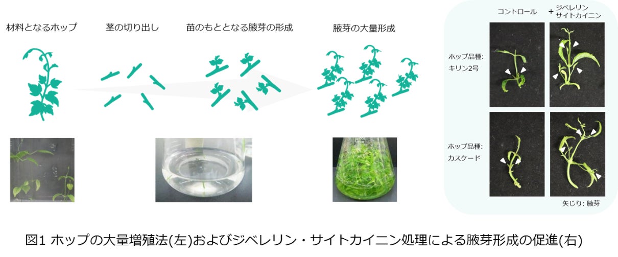 キリンホールディングス株式会社(社長 磯崎功典)のキリン中央研究所(所長 矢島宏昭)は、独自の「植物大量増殖技術」を活用し、ホップの腋芽形成を促す世界初のアプローチで、ホップの苗を50倍以上に大量増殖させることに成功しました。また、植物の成長を制御している「ジベレリン」と「サイトカイニン」を組み合わせて付与することで、増殖効率を2倍以上増やす新技術も確立しました。