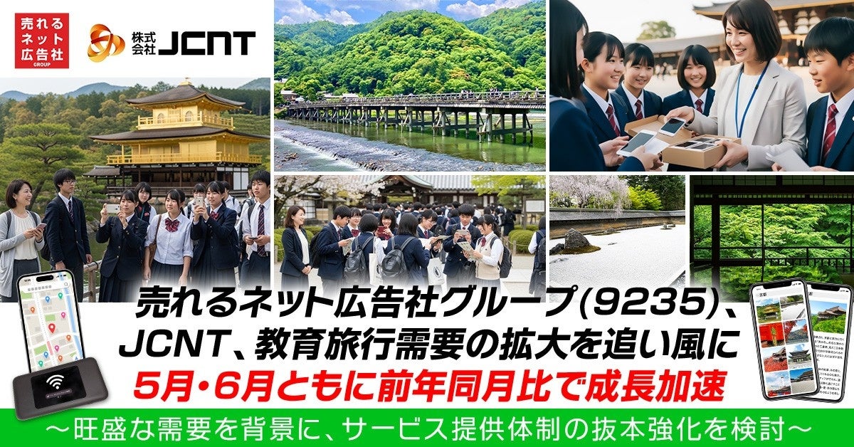 売れるネット広告社グループ(9235)、JCNT、教育旅行需要の拡大を追い風に5月・6月ともに前年同月比で成長加速~旺盛な需要を背景に、サービス提供体制の抜本強化を検討~