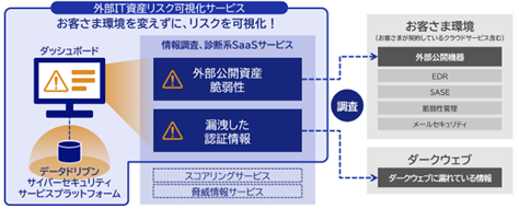 本サービスは、ランサムウェア被害要因の約8割(注2)を占める外部公開IT資産の脆弱性とダークウェブなどに漏洩された認証情報(ID/パスワード)をRecorded Future社(注3)が提供する情報などを活用してダッシュボードでリアルタイムに可視化するものです。顧客環境を変更することなく、短期導入が可能です。さらに、専門家がリスクに対する対策の優先度を提示することで、適切な対処が可能となり、不正侵入の未然防止・被害の最小化が図れます。本サービス導入後に企業が保有する運用・監視データを本サービスの基盤に集約することで、システム全体のセキュリティ対策の全体最適支援まで拡張可能です。