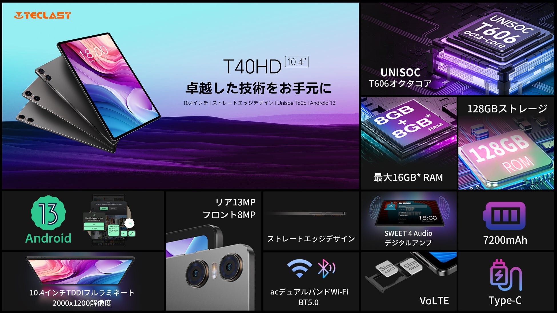 10インチ / Android 13 / 16GB(8+8拡張)RAM+128GB ROM+1TB TF拡張 / FHD IPSインセルディスプレイ / 4G LTE+WiFiモデル / Widevine L1対応 / GPS機能サポート / 3.5mmヘッドホン端子