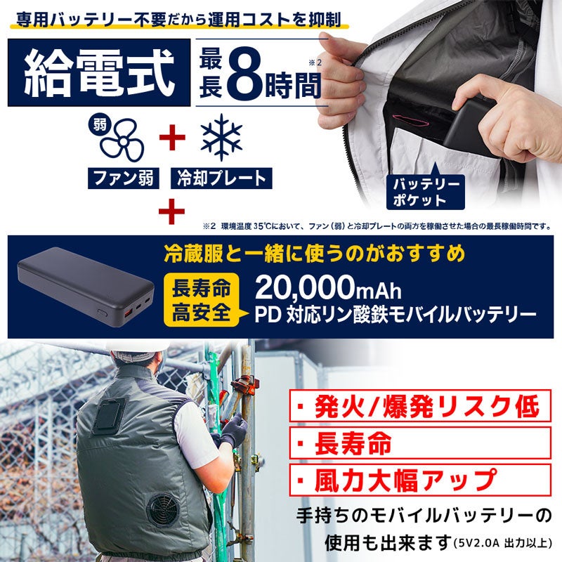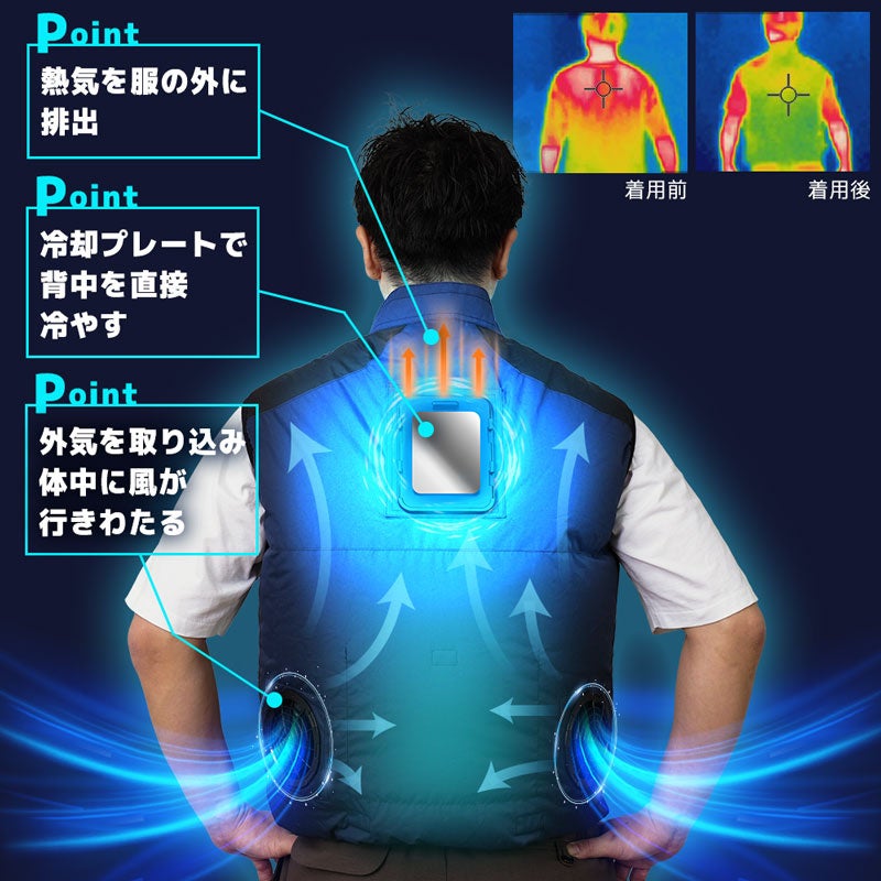 本製品は、環境温度から最大-19度冷える冷却プレートと、風が循環するファンを搭載した冷却ウェアです。