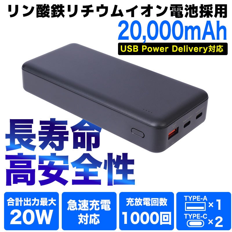 従来のモバイルバッテリーに比べて長寿命で高い安全性を誇るリン酸鉄リチウムイオンバッテリー20000mAh