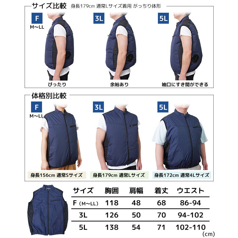 ベストと半袖の2種類。サイズはフリーサイズ(M-LL対応)/3L/5Lの3サイズ展開。