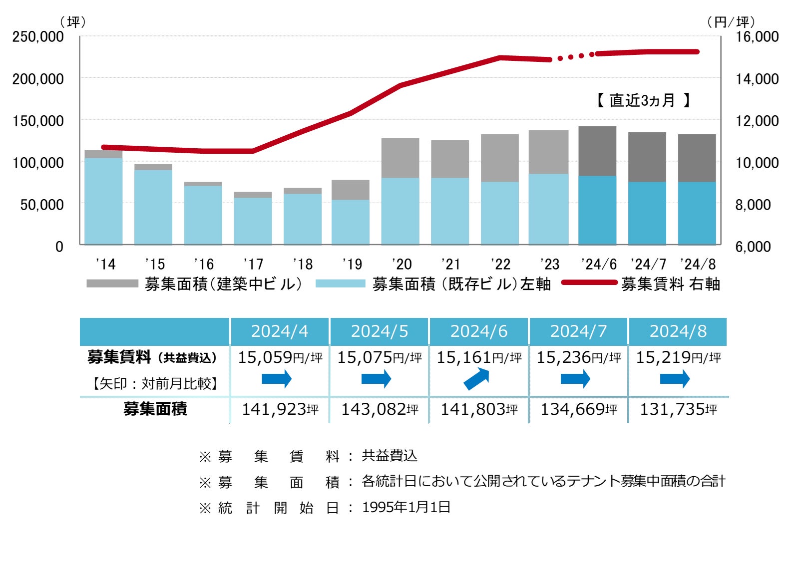 募集賃料は前月比マイナス17円/坪の15,219円/坪となった。前月からはわずかな動きに止まり、募集賃料は15,000円/坪台前半で推移している。