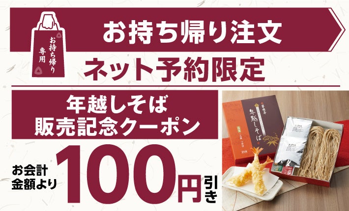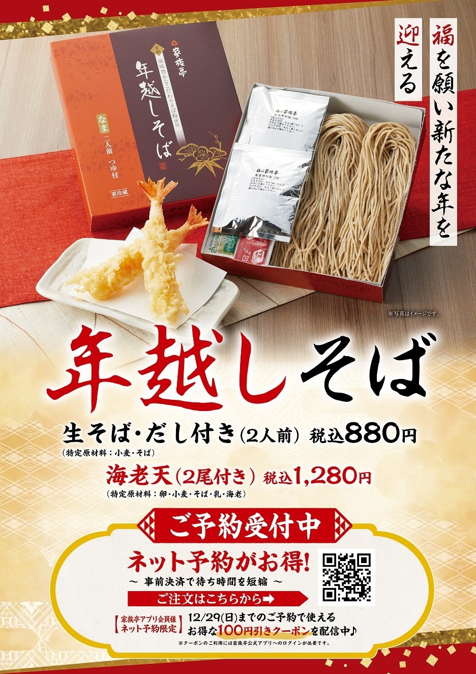 株式会社家族亭(本社・大阪府大阪市、代表取締役社長・坪山 憲司)が運営するそば和食チェーン「家族亭」は、2024年12月3日(火)より年越しそばのネットで事前予約の受付を開始いたします。何かと忙しい年末に、決済も事前に済ませて、店頭でスムーズに商品をお受け取りいただけます。また、家族亭アプリの会員になることで、お持ち帰り注文(ネット事前注文)で使えるお得な100円引きクーポンをお使いいただけます。ぜひ、この機会に家族亭アプリ会員にご登録いただき、お得なクーポンを利用して家族亭の年越しそばをご注文ください。