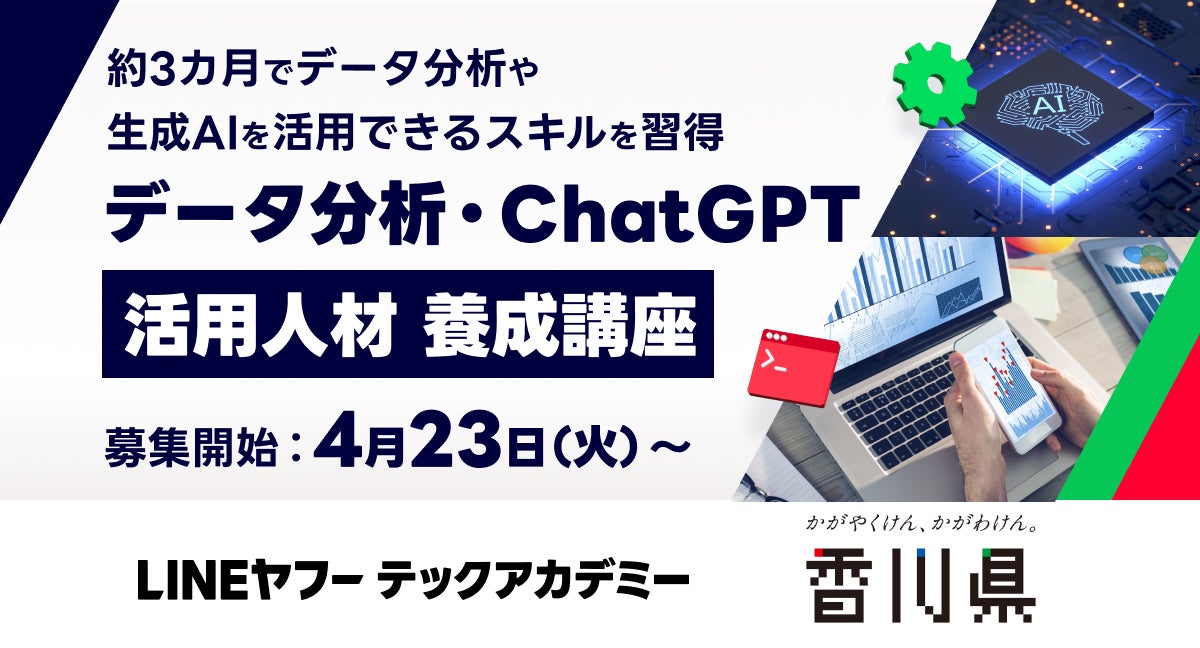 本件は、香川県が主催する「データ分析・ChatGPT人材活用講座」の運用企業を公募する中で、キラメックスが業務委託契約を締結し採択されたもので、LINEヤフーとキラメックスが共同で運営するリスキリングプログラム「LINEヤフーテックアカデミー」を通じてデータ分析や生成AIを実務で活用するためのノウハウを香川県に提供します。