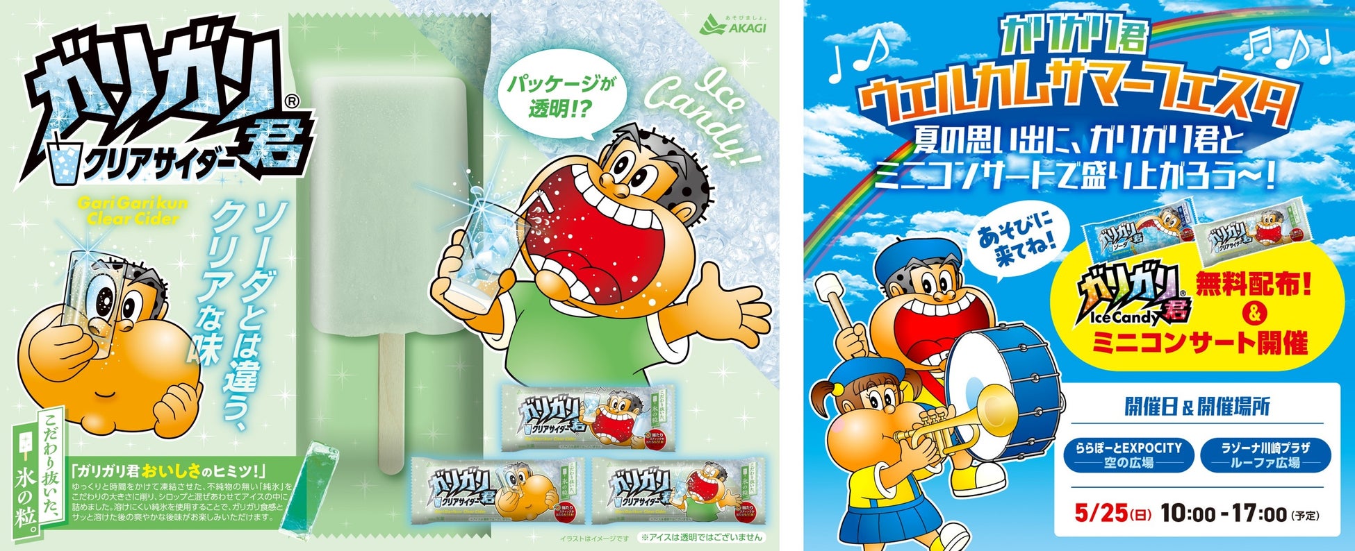 また、新商品の発売に伴い、5月25日(日)ラゾーナ川崎プラザルーファ広場、ららぽーとEXPOCITY 空の広場の2会場で定番の「ガリガリ君ソーダ」と一緒に合計2万本を無料配布するイベント、「ガリガリ君ウェルカムサマーフェスタ」を開催いたします。「ガリガリ君ウェルカムサマーフェスタ」では、「ガリガリ君のうた」を演奏・歌ってくれる団体と一緒にガリガリ君がステージに登場します。2000年に誕生した「ガリガリ君のうた」をみんなで一緒に楽しみながら、アイスを食べて楽しい夏の思い出になれば幸いです。ぜひ会場にお越しください。