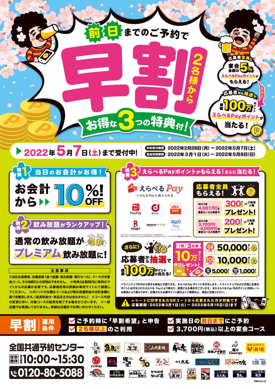 株式会社モンテローザ(本社:東京都武蔵野市、代表取締役:大神輝博)は、2022年2月28日(月)より「早割予約」の受付を開始しています。今回は「早割」ご利用時のお会計レシートに記載されているQRコードから応募することで「えらべるPayポイント」をプレゼントしており、応募者の中から抽選で「総額100万ポイントが当たる」チャンスもあります。この機会に奮ってご応募ください。
