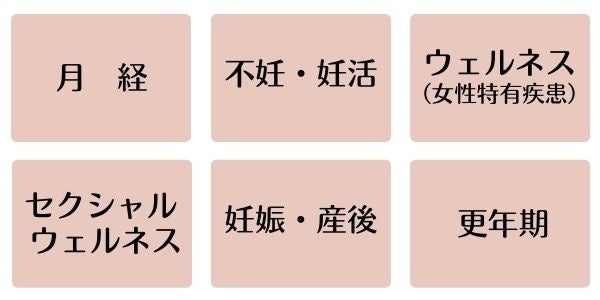 比較的新しい概念であり、フェムテックとして確立された定義は存在していないものの、女性のライフステージに沿ったからだのお悩みや健康課題に応じて、一般的には以下6つのジャンルに分類されています。ニッセンの「フェムテック特集ページ」では、100種類以上の商品を、この6つのジャンルに沿って紹介しています。