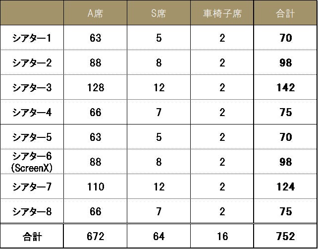さらに、シアター6には、正面スクリーンに加え、左右の壁面にも映像が投影される3面ワイドビューシアター「ScreenX」を導入し、新作映画だけでなく、人気アーティストのライブ映像など多岐に渡るラインナップをお届けしてまいります。