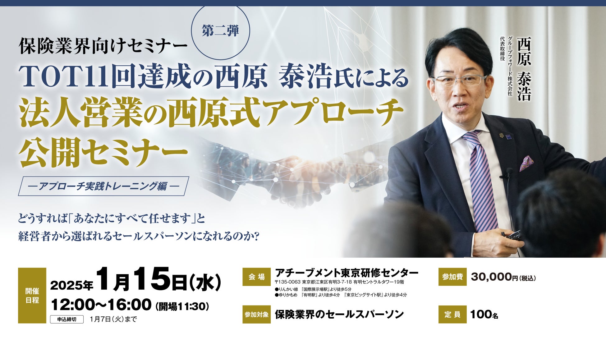 TOT11回達成・保有保障額1,400億円超の西原 泰浩氏による「法人営業セミナー」が1月15日に開催決定