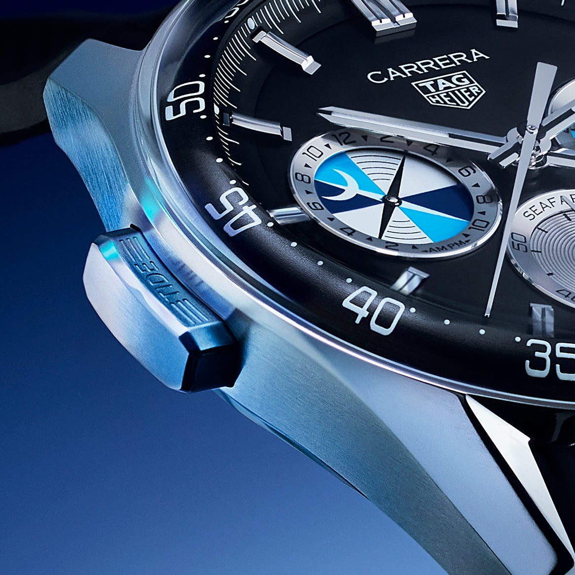 両社は、後期「シーファーラー」Ref. 2446Cのフィーリングを保ちつつも、12時位置に現在のTAG HEUERとCARRERAのロゴを配し、タグ・ホイヤーの未来を見据えるという意識的な決断を下しています。「シーファーラー」の全ヘリテージモデル同様、現在見られる「カレラ」の通常の日付表示も取り除かれ、ブラックの質感のあるラバーストラップが装着されることで、洋上で過ごすのによりふさわしいものとなっています。