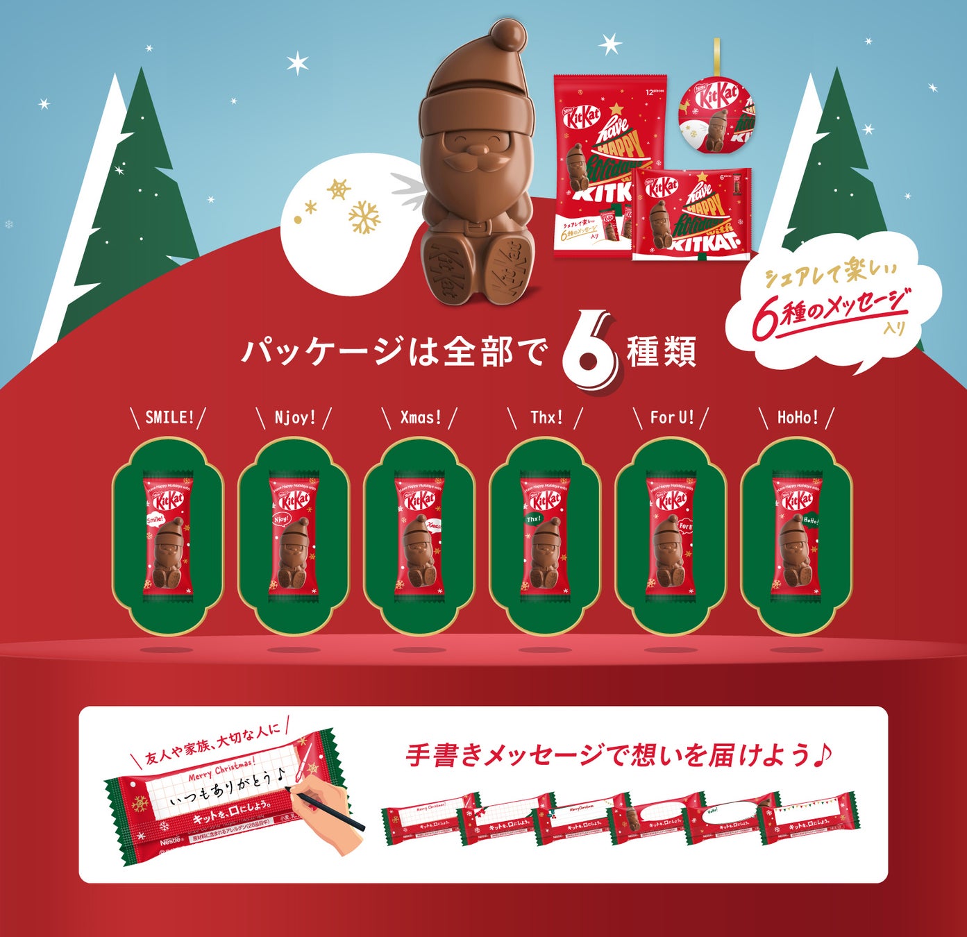 今回、「キットカット ホリデイサンタ」を通じて、様々なクリスマスの楽しみ方に対応するため、新たなラインアップを加えて、11月5日(火)よりシーズン限定で販売を開始します。自分用やみんなでシェアするシーンにぴったりな”小袋”タイプと、家族や友人とのパーティーや職場で同僚にシェアするシーンなどにぴったりな”大袋”タイプに加えて、日頃の感謝の気持ちを特別感あるパッケージで伝えるプレゼントシーンやクリスマスツリーにオーナメントとして飾り付けにもおすすめの”オーナメント缶”タイプを発売します。各製品の個包装正面には“Xmas!”, “Thx!”, “For U”など6種類のメッセージがデザインされています。また、裏面には、昨年にはなかった手書きメッセージ欄が追加され、ちょっとした気持ちをカジュアルに伝えることができます。その他、クリスマスケーキに“サンタ型キットカット”を飾るなど、手作りお菓子やデザートのデコレーション素材としても活用することができます。
