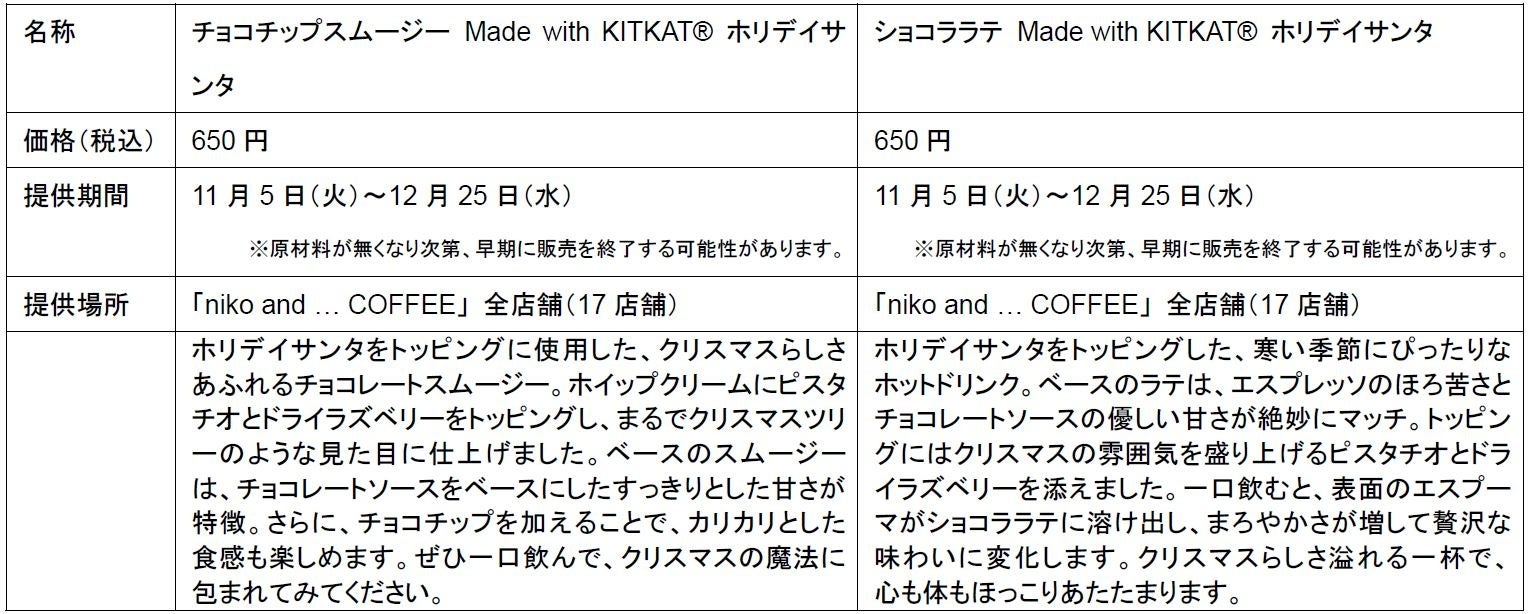 友人や家族と過ごすクリスマスをもっと笑顔あふれる豊かなものにしたいという想いから、ユニークな見た目の「キットカット ホリデイサンタ」と、実用性とユーモア、驚きを兼ね備えたアイテムを通じて自分自身のライフスタイルを発見できるスタイルエディトリアルブランド「niko and …」が初コラボレーションを実施します。「キットカット ホリデイサンタ」のコンセプト「キット、みんな笑顔になるよ。」をテーマに開発したスペシャルドリンクメニューを「niko and …」のカフェブランド「niko and ... COFFEE」にて11月5日(火)より提供します。