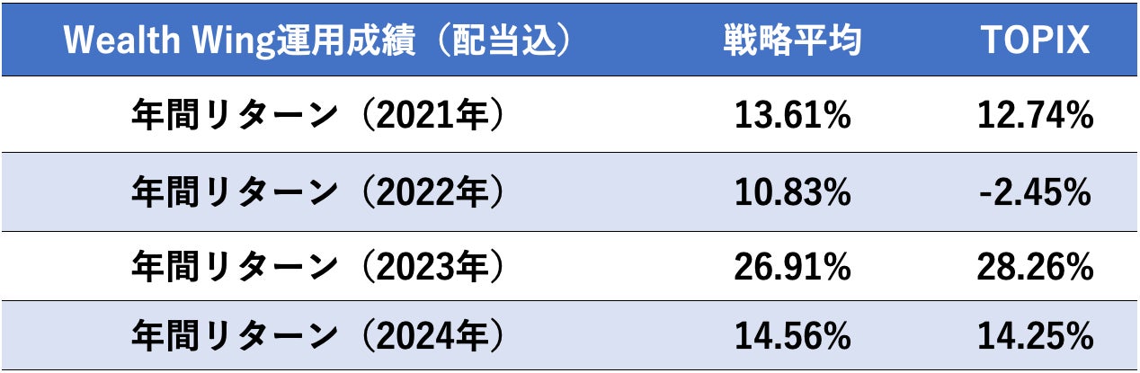 次世代金融インフラの提供を通して組込型金融を実現し、金融がもっと暮らしに寄り添う世の中を創るFinatextグループの証券会社、株式会社スマートプラス(本社:東京都千代田区、代表取締役:小林 紀子、以下「当社」)が提供する、日本株おまかせ投資サービス「Wealth Wing(ウェルスウイング)」にて、2024年9月の運用結果が最も良かった戦略は日本株市場(東証株価指数、以下「TOPIX(配当込み)」)を1.95%上回りました。