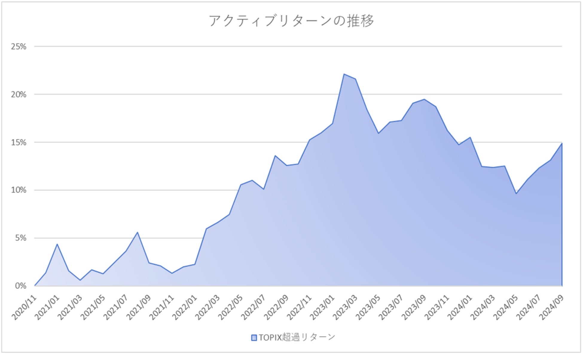 2020年11月末のサービス開始から2023年12月末までの各年の運用実績は10%を超えており、2024年の年初来リターンは9ヶ月経った時点で+14.56%となりました。