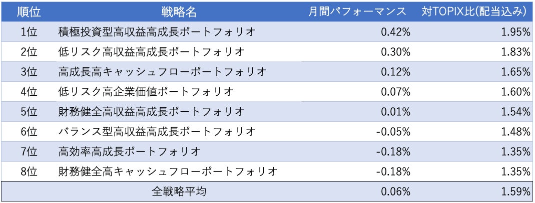 Wealth Wingがご提供する全8戦略の平均運用成績は、月間で+0.06%、対TOPIX比で+1.59%となりました。