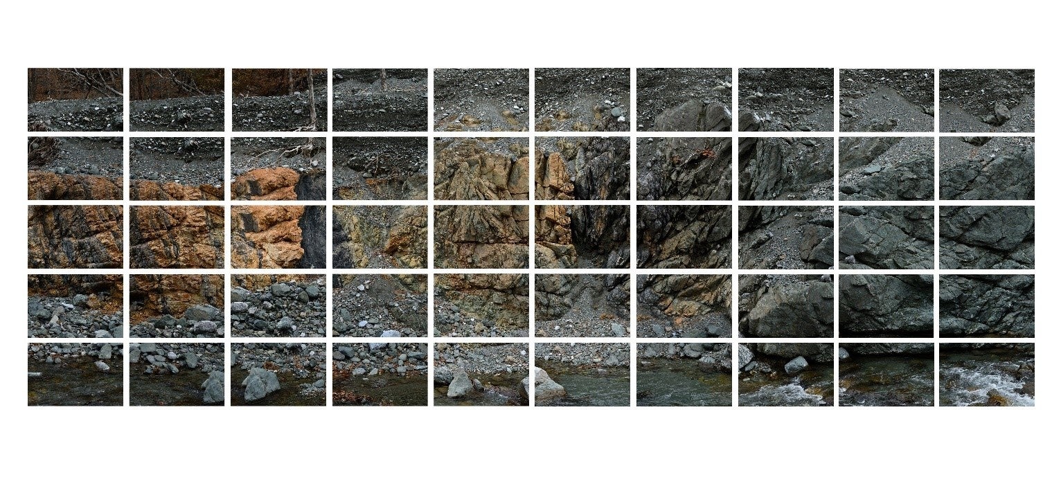 崖の分割写真が現場のリアルさを追った表現であるのに対して、これらの地形写真は地質的に日本列島を南北に分断する中央構造線のスケールを心象風景としてイメージ化したものです。
